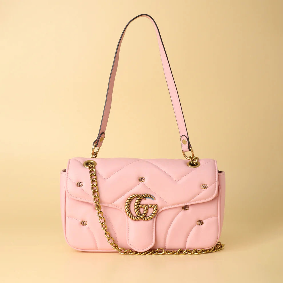 Crafted from supple, quilted leather in a soft blush tone, this bag is the epitome of refined style with a touch of playful charm. The iconic antique-gold GG hardware and subtle stud details on the flap add a vintage-inspired feel, while the versatile chain strap allows you to wear it on your shoulder or as a crossbody. It's the perfect size for carrying your essentials, making it an ideal choice for both day and night.